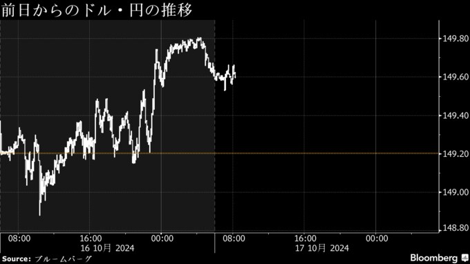 (ブルームバーグ):17日の東京外国為替市場の円相場は1ドル=149円台半ばで推移。米国株の上昇で投資家心理が改善したことが重しとなる一方、150円の心理的節目を前に国内企業による円買いも意識され下げ渋っている。日本時間夜発表の9月の米小売売上高を前に積極的な取引は手控えられそうだ。