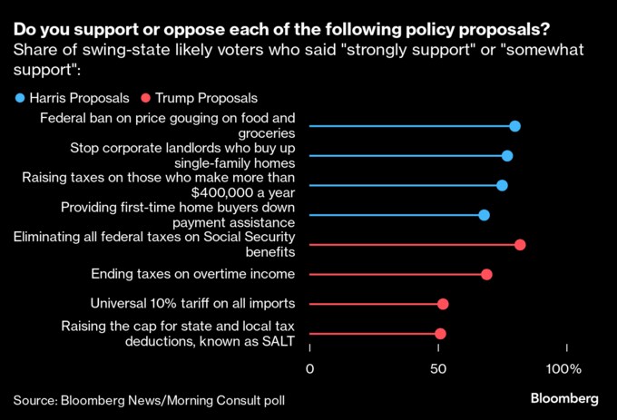 ブルームバーグとモーニング・コンサルトが行った9月の世論調査によると、すべての輸入品に10%の関税を課すとのトランプ氏の提案について、激戦州の有権者の過半数が強く賛成、またはある程度賛成だと回答した。