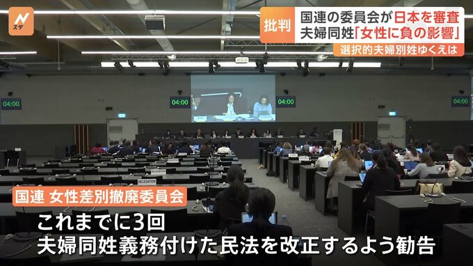 女性差別の撤廃を目指す国連の委員会が開かれ、日本の取り組みを8年ぶりに審査しました。夫婦同姓を義務付けた民法について委員からは女性に「負の影響が出ている」と批判の意見がでました。記者「日本から駆け付…