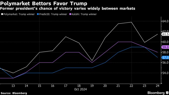 ニューヨークに本社を置くポリマーケットにとって、大統領選を巡る賭けは最も人気が高く、その規模は今年これまでに24億ドル近くに膨らんでいる。24日時点にポリマーケットで想定されているトランプ氏の当選確率は61.6%。同業カルシーの59%やプレディクトイットの57%を上回る。
