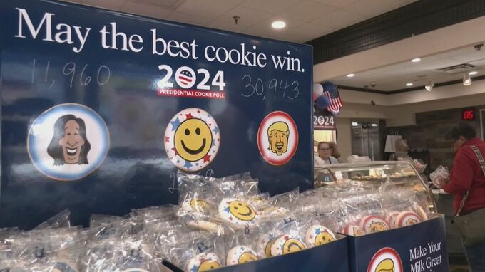 アメリカ大統領選を前に、オハイオ州のベーカリーではある変わった方法でどちらが勝利するかをうらなっています。店に入ってきた男性、手を伸ばした先にあるのは、クッキーです。大統領選をたたかう民主党ハリス副…