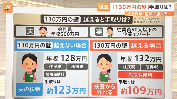 ファイナンシャルプランナーの塚越さんによると、130万円の壁を越えた場合、年収128万円と同じ手取りにするには、「社会保険加入の場合、年収153万円でようやく手取りが約123万円に」なるということです。
