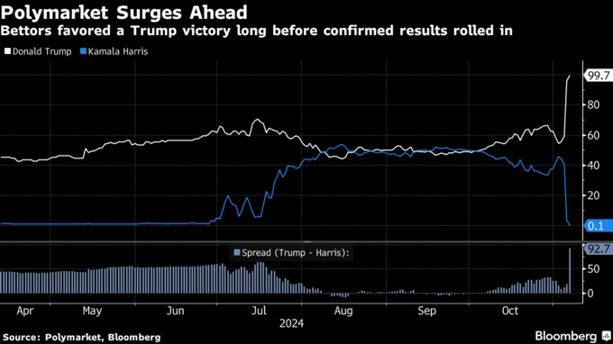 投票日までの数日間、世論調査ではトランプ氏と民主党のライバル候補であるカマラ・ハリス氏との接戦が続いていたが、賭け市場ではトランプ氏がリードしていた。