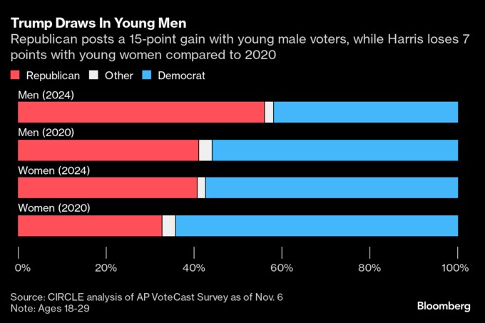 タフツ大学市民学習・参加研究センターが分析したデータによると、トランプ氏は20年には41%だった若い男性からの支持を56%に伸ばした。