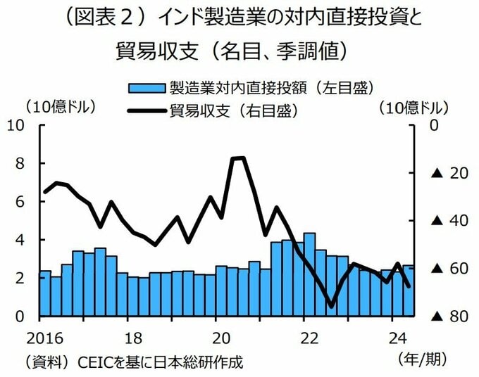 もっとも、製造業全体としてみれば、インドの国際競争力は引き続き低位だ。インドの貿易赤字は2020年代に入ってから一段と拡大しており、とくに中国からの輸入が急増している。海外からインドへの直接投資の伸び悩みが競争力の向上を阻害するという見方もある。これは、経済安全保障の観点から実施されている事前審査制(国境を接する国からの投資が対象)が中国香港からの投資を抑制していることが一因であると考えられる。