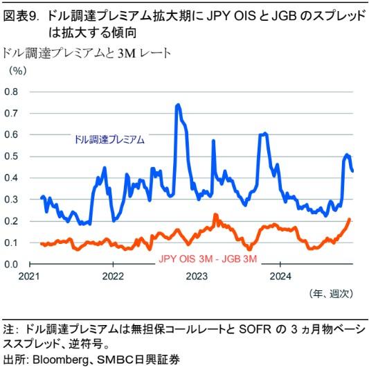 前述したように、国庫短期証券の需給の強さは、国内金融機関の担保需要とドル調達プレミアムが影響している。担保需要について、貸出増加支援資金供給オペにおける貸付期間の短期化や貸付利率の変動金利化が決定されたことにより、今後は担保需要が減少する可能性がある。ドル調達プレミアムについて、プレミアムの拡大期にJPY OISと JGBのスプレッドも拡大する傾向がある(図表 9)。ドル調達プレミアムが縮小する要因として、ドル需要の後退が挙げられる。例えばドットチャートの導入に伴う日米短期金利差の縮小で円高圧力が高まれば、ヘッジ付き外債投資の需要が減退する、すなわちドル需要が後退する可能性がある。