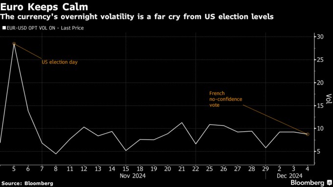 不信任決議案の可決はすでに市場に織り込まれており、フランス国債先物は投票後も上昇を維持した。ユーロ・ドル相場のオーバーナイト・ボラティリティー(変動率)の指標も低水準にとどまった。