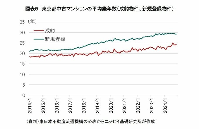 また、成約件数と新規登録件数から求めた新規成約率4の推移をみると、東京都では回復基調にあった高価格帯マンションの売れ行きがやや鈍化している(図表4)。2024年第3四半期(7-9月)の新規成約率は、「7,000万円以上1億円未満」が30%(前期比▲4.4%)、「1億円以上」が22%(同▲3.5%)に低下した(図表4)。新規登録物件の平均築年数が約30年に上昇し、成約物件の築年数(25年)とのミスマッチも見られるなか(図表5)、購入希望者が売主の価格設定に追随するか、今後の動向を注視したい。