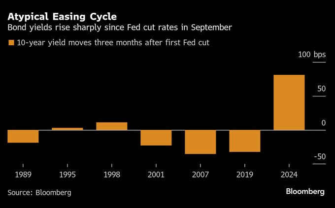 連邦公開市場委員会(FOMC)が9月に政策金利の引き下げを開始して以来、米10年債利回りは0.75ポイント余り上昇。利下げサイクルの最初の3カ月としては、1989年以来の大幅な上昇となった。この常識に反する動きは損失を招いた。