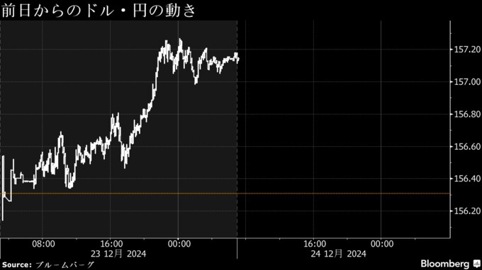(ブルームバーグ):24日朝の東京外国為替市場の円相場は1ドル=157円台前半と、前日夕から水準を下げて推移。日本銀行の利上げ観測後退と米連邦準備制度理事会(FRB)の利下げ慎重姿勢を背景とした円売り・ドル買い基調が続いている。