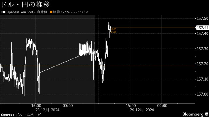 (ブルームバーグ):26日の東京外国為替市場の円相場は1ドル=157円台半ばに小幅下落。薄商いで値動きが大きくなりやすい中、年末に向けた実需のドル買い・円売りが優勢となった。日本銀行の植田和男総裁の前日の講演が追加利上げに慎重と改めて受け止められたことも、円の重しになっている。