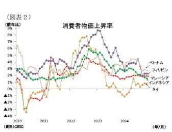 東南アジア5カ国の消費者物価上昇率(以下、インフレ率)は落ち着いた動きとなっている。2022年は世界的なインフレの波が東南アジアにも到来したが、昨年はエネルギー価格の下落や各国中銀の金融引締め等によりインフレの鈍化傾向が続いた。そして今年前半は天候要因を背景とした食料インフレや通貨安を受けて上昇傾向がみられたものの、インフレは概ね安定して推移した。