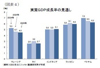 国別にみると、経済の輸出依存度が高いベトナム、マレーシアは輸出と製造業の回復によって2024年が高い成長となっただけに、2025年は成長率が鈍化しやすい。一方、フィリピンとインドネシア、タイのように景気動向が緩慢だった国は堅調な成長軌道が続くだろう。