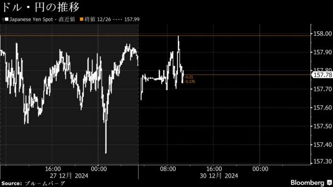 (ブルームバーグ):30日の東京外国為替市場の円相場は1ドル=157円台後半で推移。金融機関が外為取引の基準レートとする公示仲値の設定にかけてドル買いが強まる場面も見られたが、日本の通貨当局による円安けん制への警戒感が円を下支えしている。