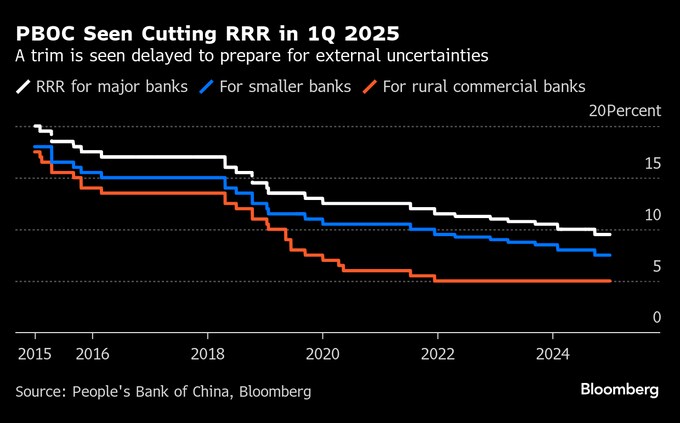 人民銀行は以前、昨年末までに市中銀行の預金準備率をあと1回引き下げることで、銀行にさらに多くの資金の余地を作ると示唆していた。米次期政権が新たな関税を課した場合の悪影響を緩和する手段を温存するため、今では、この引き下げは今年1-3月期(第1四半期)に行われるとみられている。