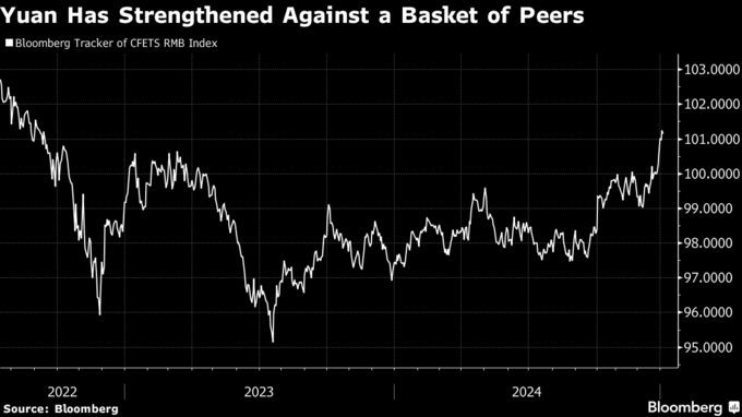 ブルームバーグの中国外国為替取引システム(CFETS)指数トラッカーによると、人民元は韓国ウォンやユーロを含む貿易相手国の通貨バスケットに対して、2022年10月以来の高値水準まで値上がりし、中国輸出企業の競争力を弱めた。