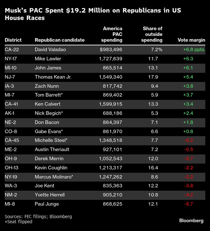 連邦選挙委員会(FEC)に提出された公開報告書によると、マスク氏が管理する政治活動委員会(PAC)「アメリカPAC」は、昨年の選挙戦最後の6週間で1920万ドル(約30億円)を投じ、接戦となっていた全米各地の共和党候補を支えた。