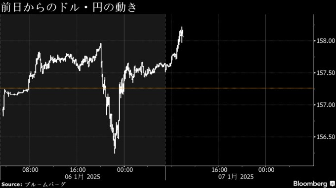 (ブルームバーグ):7日の東京外国為替市場の円相場は1ドル=158円台前半と、昨年7月以来の安値に下落した。金融機関が外為取引の基準レートとする公示仲値の設定にかけて円売りが強まった。