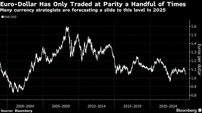 (ブルームバーグ):1999年にユーロが誕生して以降、対ドルでパリティー(等価)となったのは数回のみだ。直近は2022年。ロシアのウクライナ全面侵攻による欧州エネルギー危機で景気後退懸念が高まり、1ユーロ=1ドルまで下落した。足元で市場関係者は再び同様の事態が起きる可能性があると見ている。
