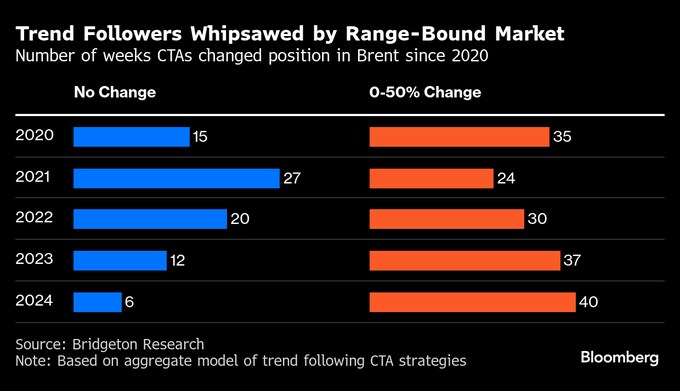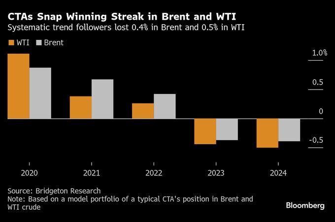 コンピューターによる取引分析を提供するブリッジトン・リサーチ・グループによると、CTAは昨年、ここ10年余りで初めて原油先物取引で2年連続の損失となった。