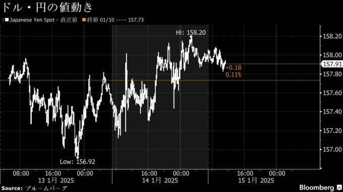 (ブルームバーグ):15日の東京外国為替市場の円相場は1ドル=157円台後半で底堅く推移。来週開かれる日本銀行の金融政策決定会合に向けて、利上げを織り込む動きが円を支えている。