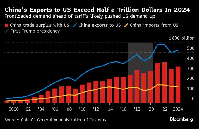 2024年の中国貿易黒字は過去最高の1兆ドル(約156兆円)近くに達した。これは国内総生産(GDP)の5%余りに相当する。昨年は景気拡大の3割程度を貿易黒字がけん引。その割合は1997年以来最も高い。先週発表された統計で示された。