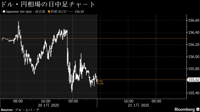 (ブルームバーグ):21日朝の東京外国為替市場の円相場は1ドル=155円台半ばと前日夕と比べて円高水準で推移。就任初日のトランプ米大統領から新たな関税についての詳細発表がまだなく、ドルが売られている。日本銀行が今週追加利上げに踏み切る公算が大きく、東京市場でも円は堅調に推移しそうだ。