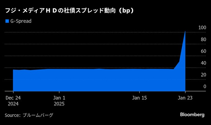 一方、相次ぐ広告差し止めから業績懸念が浮上し、2028年12月に満期を迎えるフジHD債のスプレッドは23日に、100ベーシスポイント(bp、1bp=0.01%)を超えた。ブルームバーグのデータによると、22日は約50bp、21日は約37bpだった。社債スプレッドは一般的に企業の信用力に応じて変動し、信用力が低下すると拡大する。