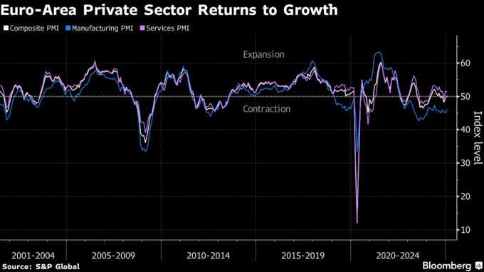 (ブルームバーグ):ユーロ圏の民間部門の経済活動が、3カ月ぶりに縮小を脱した。苦境の続く製造業にもわずかな改善の兆しが見られ、アナリストらを驚かせた。