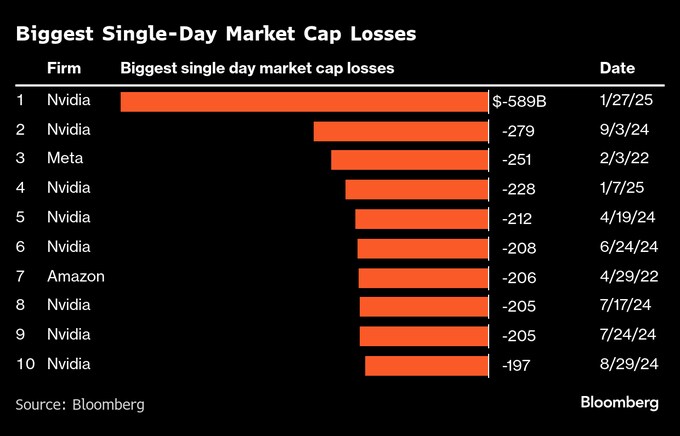 原題:Nvidia’s $589 Billion DeepSeek Rout Is Largest in Market History(抜粋)