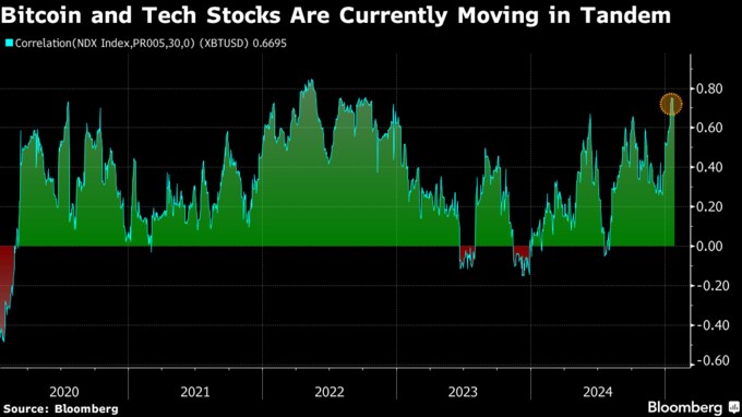 米ハイテク株との相関関係の強さは、ビットコインの弱さを浮き彫りにする。ブルームバーグが集計したデータによると、ビットコインとナスダック100指数の30日間の相関係数は約0.67。同係数はプラス1の場合、両資産が歩調を合わせ動くことを示し、マイナス1なら逆方向に動くことを表す。