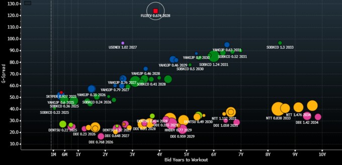 ブルームバーグのデータによると、28年12月に満期を迎えるフジHD債のスプレッドは30日時点で約124ベーシスポイント(bp、1bp=0.01%)と過去最高を再び更新した。23年12月の発行後、昨年末まではおおむね30bp台で推移していたが、騒動を受けて急上昇した後なかなか縮小しない。