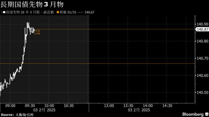 (ブルームバーグ):3日の債券相場は朝方の下落から上昇に転じた。トランプ米大統領の関税政策によるインフレ再燃懸念から米国の長期金利が上昇した流れを引き継ぎ売りが先行したが、日本株が大幅に下げたことを受け安全資産の国債がリスク回避で買われた。
