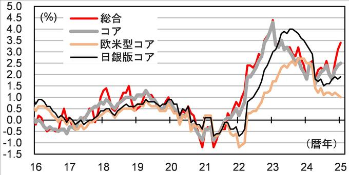 2つ目は、身近なものの価格上昇が示された1月の東京都区部CPIの結果である(1月31日公表)。コア(生鮮食品を除く総合)の前年同月比+2.5%と、前月(同+2.4%)から小幅な加速でとどまり、市場予想と一致したのだが、生鮮食品価格(前月の同+18.4%から、同+23.8%に加速)の上振れ幅が大きく、総合の伸び率がやや大きく高まった(前月の同+3.1%から、同+3.4%に加速)。市場予想は同+3.0%だったことを考慮すると、生鮮食品の上振れ幅がかなり大きかったと言える。