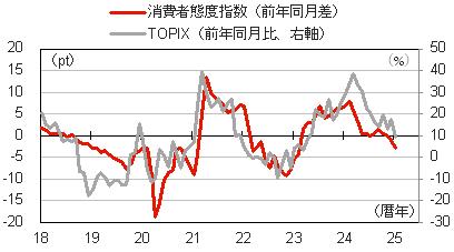 このように考えるのは、そもそも23年以降は消費者態度指数(前年同月差)と実質賃金の連動性が低下していることに注目しているからである。22年までは実質賃金の低迷に合わせて消費者態度指数は低下したが、23年はさらに実質賃金が低下したのにもかかわらず、意外なことに消費者態度指数は回復した。この背景として説明できそうなのが、株価など資産価格の上昇である。この間も、消費者態度指数の動きとTOPIXの前年比の動きはかなり連動していた。この点に注目すると、前述した23年の消費者態度指数と実質賃金の動きの乖離については、実質賃金は悪化していても資産価格が上昇していたことから消費マインドは悪化しなかった(むしろ改善した)と考えることが出来る。22年に流行した「悪い円安」の議論以降、円安は物価高を介して家計にはネガティブだという認識が広がっているが、実際には資産価格の上昇(資産効果)もしっかりと反映されていたようである。