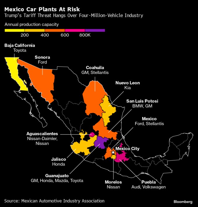 シティグループは、メキシコとカナダで事業展開する日本の大手自動車メーカー4社の年間利益の合計減少額を1兆5800億円(約102億ドル)と推定している。トヨタ自動車はメキシコのバハカリフォルニア州とグアナフアト州の2カ所に生産拠点があり、ピックアップトラックの「タコマ」を組み立てている。両拠点で北米市場向けに年間約26万台を生産している。