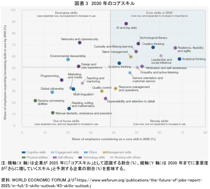 「Future of Jobs Report 2025」では、労働者のスキルについて、2025年時点のコアスキルと企業が認識する度合と、2030年に向けて重要度が増すと企業が予測する度合を軸に、4つの象限に分類している。