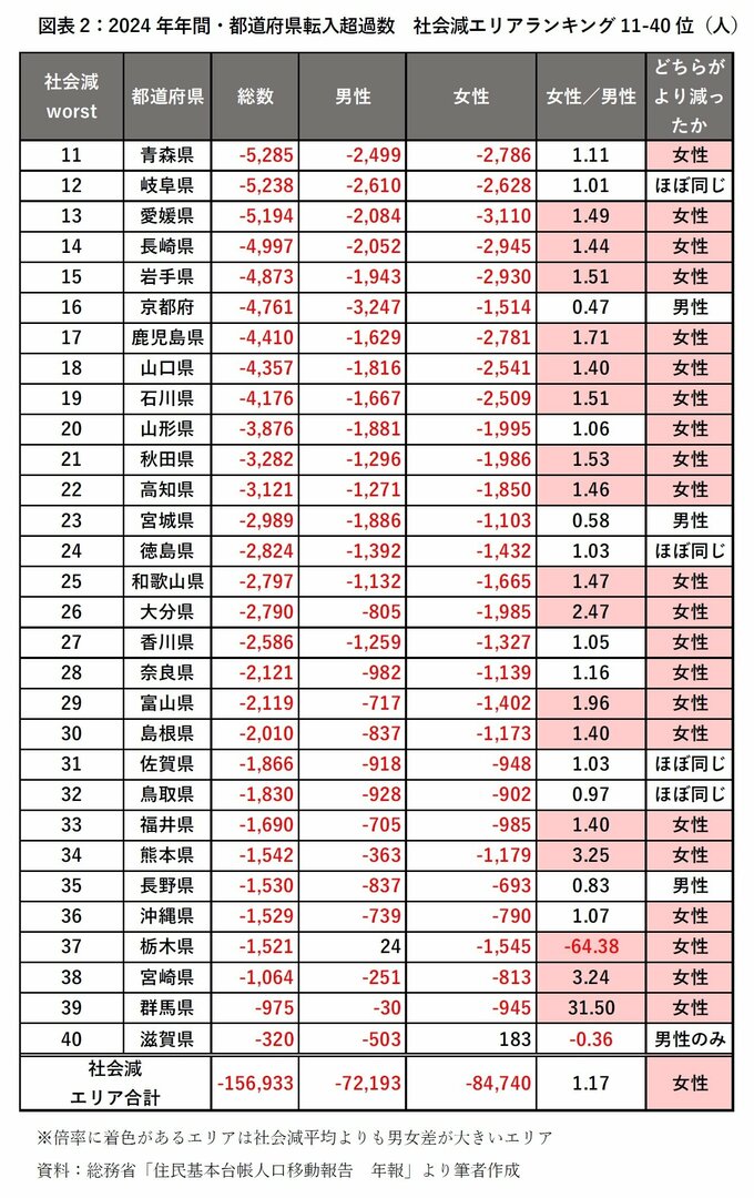 結果的に15万6933人の人口が社会減40エリアから社会増7エリアへと移動した1。前年2023年は14万1706人であったので、111%の社会減増となっている。つまり、社会減エリアから社会増エリアへより多くの人口が移動する結果となった。
