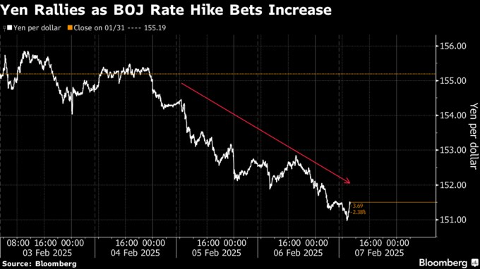 円は今週に入り、米国のトランプ大統領が関税発動に動く中で安全資産としての魅力を発揮し上昇した。円買いは5日発表の昨年12月の名目賃金の伸び率が約30年ぶりの高水準となったことで勢いづき、6日に日銀の田村直樹審議委員が2025年度後半には少なくとも1%程度まで短期金利を引き上げるべきだと発言したことでさらに加速した。