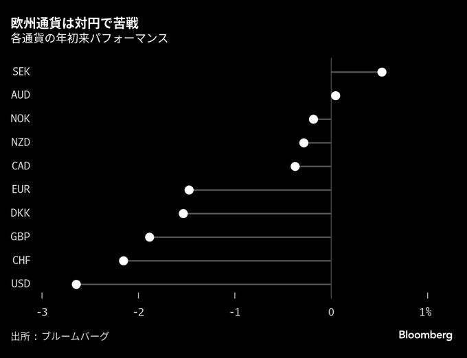 こうした状況から、円は1月以降、スイス・フラン、英ポンド、ユーロに対して約2%上昇している。