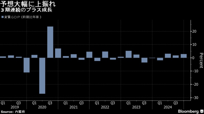 内閣府が17日発表した実質国内総生産(GDP)速報値は前期比年率2.8%増、前期比0.7%増だった。市場予想はぞれぞれ1.1%増、0.3%増が見込まれていた。