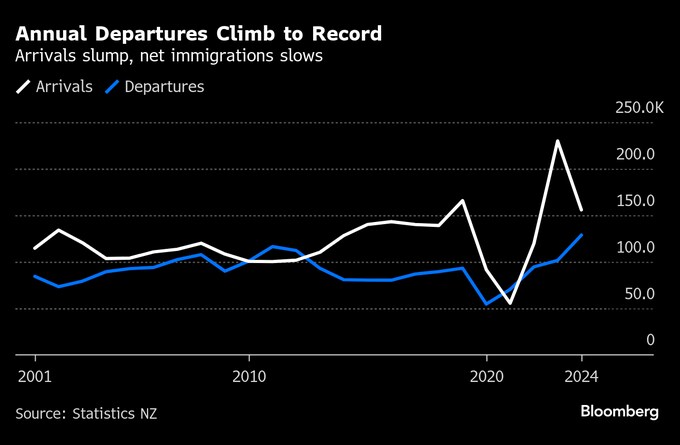 原題:New Zealand Sees Record Number of Departures Amid Weak Economy(抜粋)