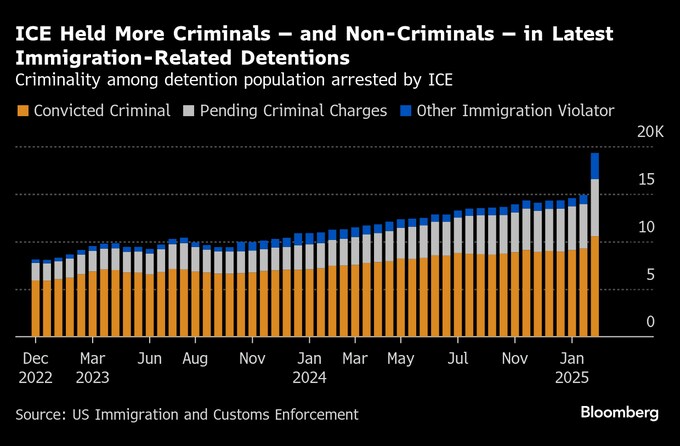 (ブルームバーグ):米移民・税関捜査局(ICE)はトランプ政権発足後の2週間で約1万人を拘束したことがデータで明らかになった。ホワイトハウスが不法移民の強制送還の強化に取り組んでいることが浮き彫りになった。