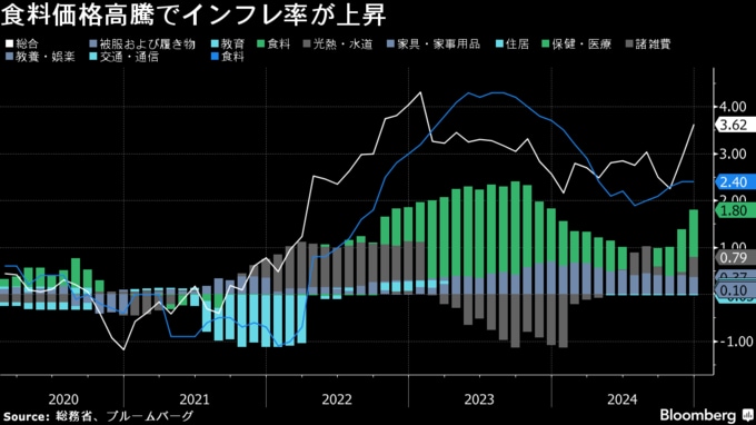 ブルームバーグの調査によると、1月の生鮮食品を除くコアCPIは前年比3.1%上昇と前月の3.0%を上回る伸びが見込まれている。生鮮野菜などの価格高騰が影響し、総合指数は4.0%上昇と前月(3.6%上昇)から大きく伸びが拡大する見通し。4%台に乗せれば、2023年1月(4.3%上昇)以来、2年ぶりの高水準となる。