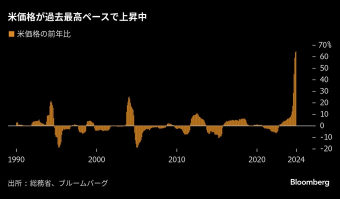 政府は14日、高騰する米価格を抑制するため、備蓄米21万トンを市場に放出すると発表した。農林水産省の発表によると、スーパーでの米の販売価格は一段と値上がりし、9日までの1週間では5キロ当たり3829円と前年比90%上昇した。米は生鮮食品には分類されないが、外食などサービス価格にも高騰の影響が波及しており、その価格動向も焦点の一つとなる。