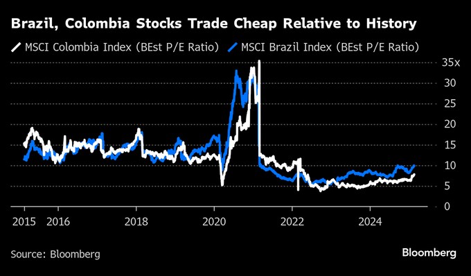 いずれの市場でも、極めて割安な株価水準も有利に働いている。ブルームバーグがまとめたデータによれば、中南米株の株価収益率(PER)は12カ月の予想利益に基づくと8.6倍と、10年平均の11.5倍を大幅に下回っている。