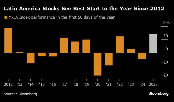 中南米の株価指数は12年以来最良の年初スタートとなっており、米S&P500種株価指数の5倍以上のリターンを記録。他の新興国市場と比較しても倍のリターンだ。