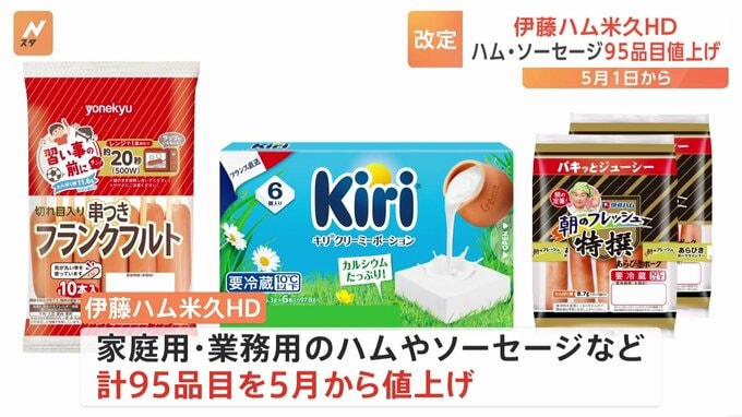 伊藤ハムと米久は、ハムやソーセージなど95品目を値上げします。値上げは5月からで、家庭用と業務用のハムやソーセージなどあわせて95品目が対象です。伊藤ハムの「朝のフレッシュ あらびきポークウインナー」や…