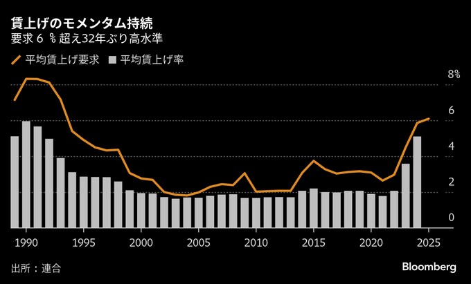 (ブルームバーグ):日本最大の労働組合の全国組織である連合は6日、2025年春闘の賃上げ要求が6%を超えたと発表した。6%を上回ったのは32年ぶり。賃金上昇のモメンタム(勢い)持続を示唆する内容で、金融政策の正常化を進める日本銀行にとって好材料と市場は受け止めそうだ。発表後、外国為替市場では円買いが優勢となっている。