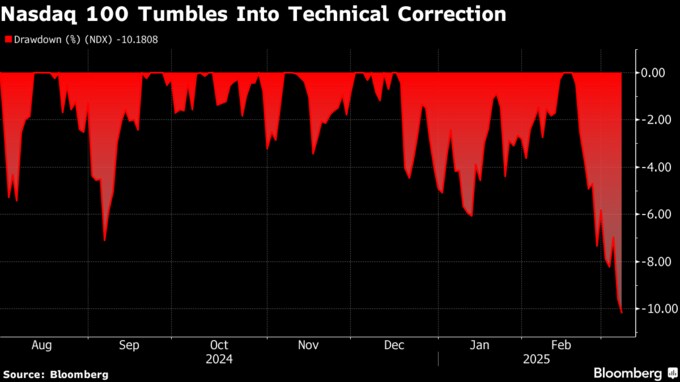 ニューヨーク時間午前10時37分時点で同指数は前日比0.8%下落。先月に付けた高値からの下落率は調整局面入りの目安である10%を超えた。ハイテク大手7社「マグニフィセント・セブン」は2月下旬に調整局面に入っていた。